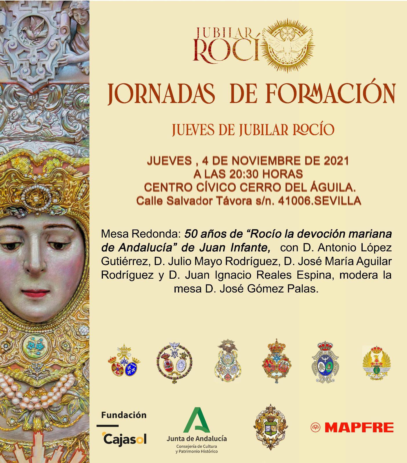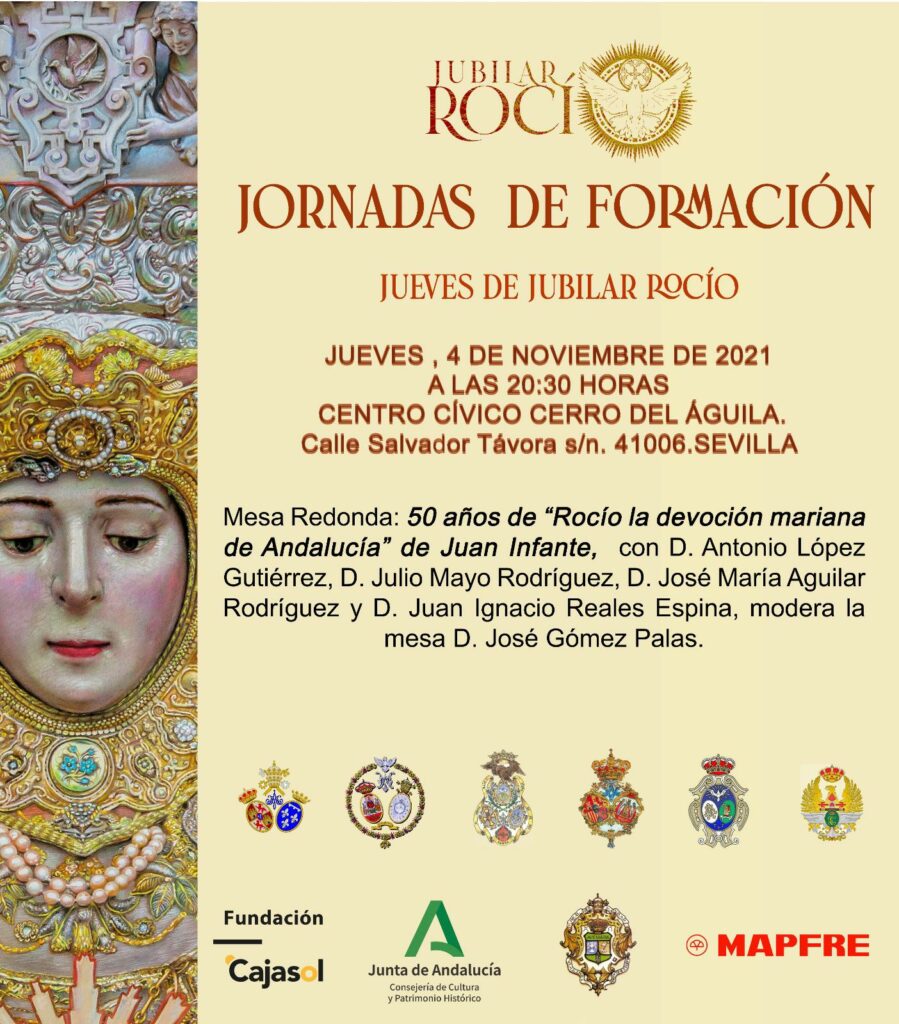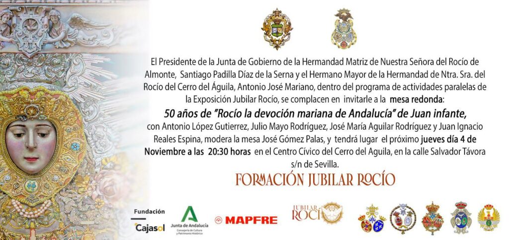 Acoge la mesa redonda: “Rocío la devoción mariana de Andalucía” en el 50 aniversario del libro de Juan Infante Galán. A cargo de Antonio López, Julio Mayo, José María Aguilar y Juan Ignacio Reales. Moderada por Pepe Gómez Palas.