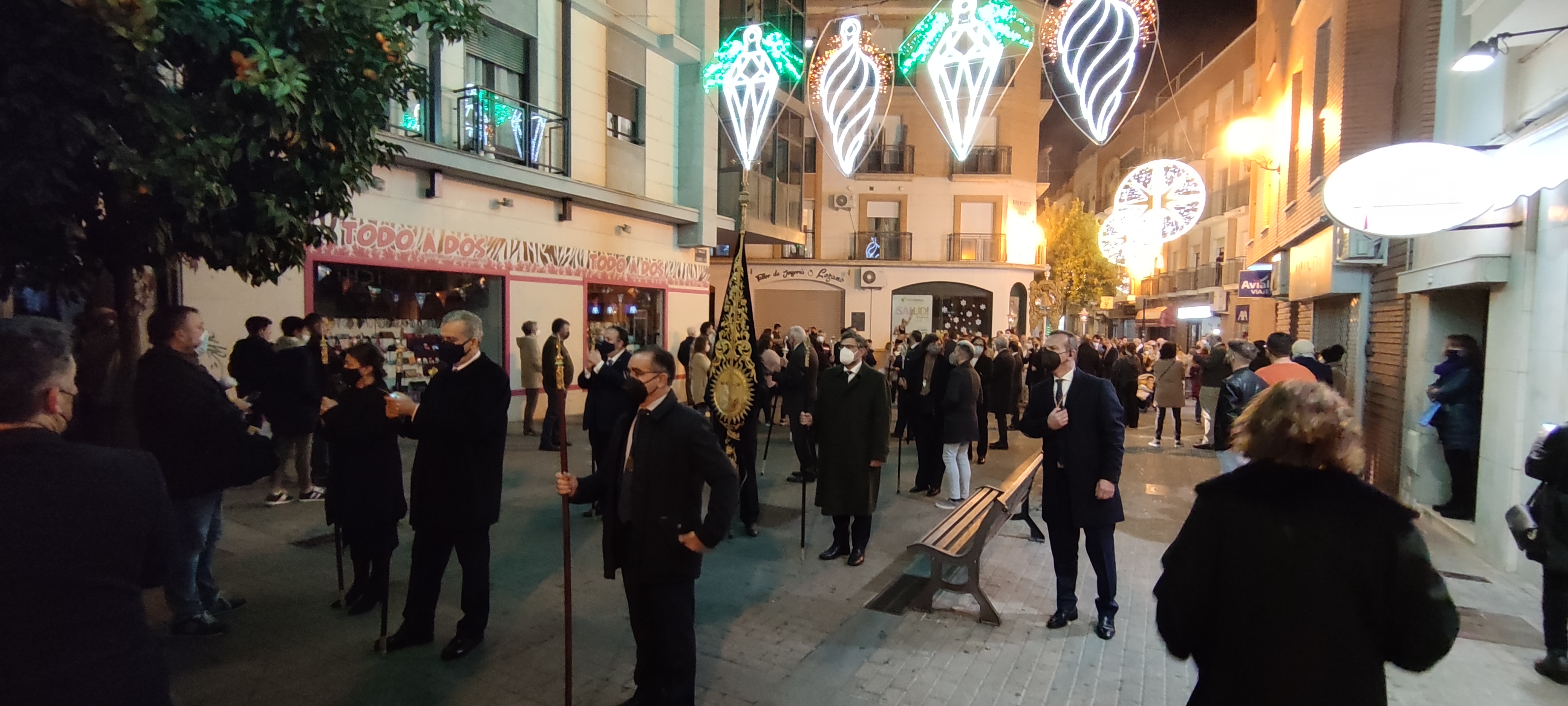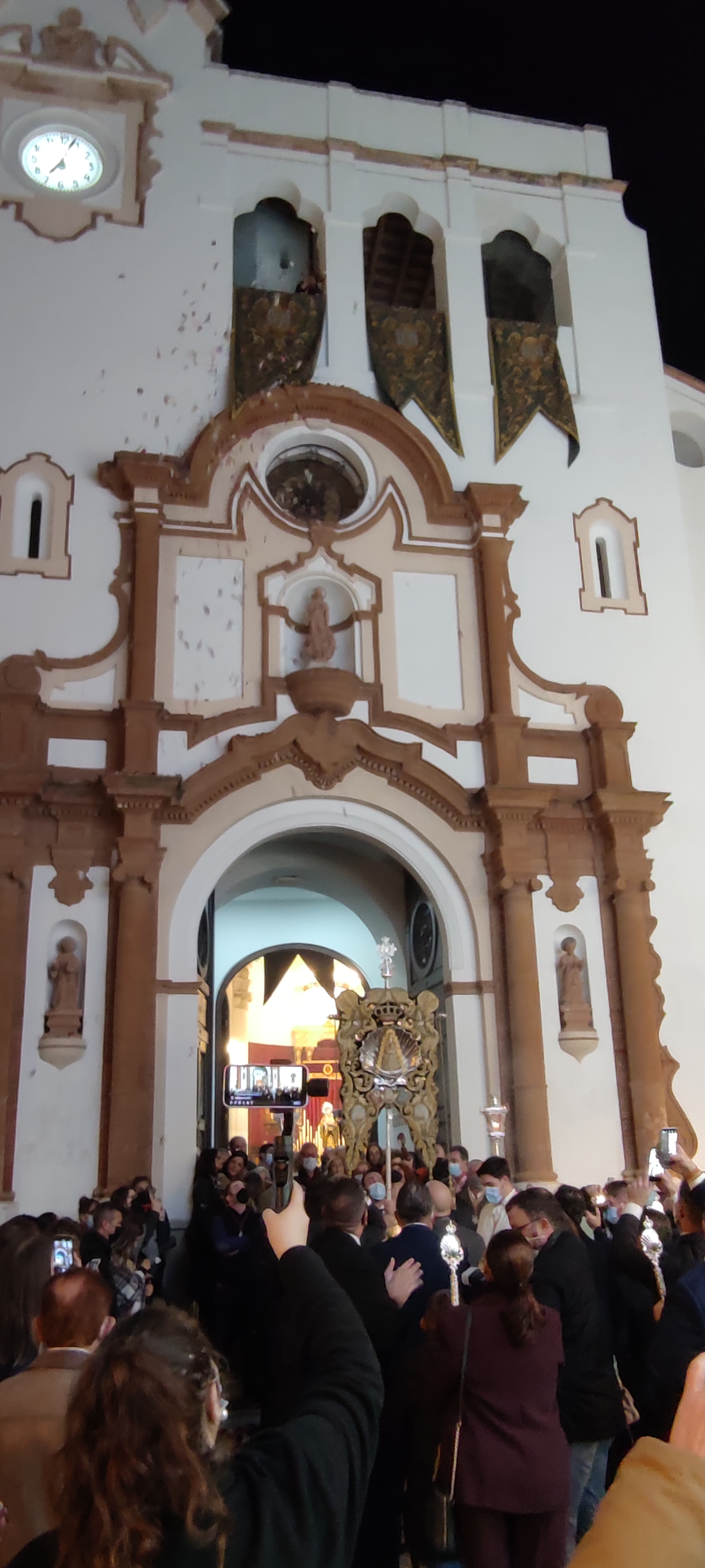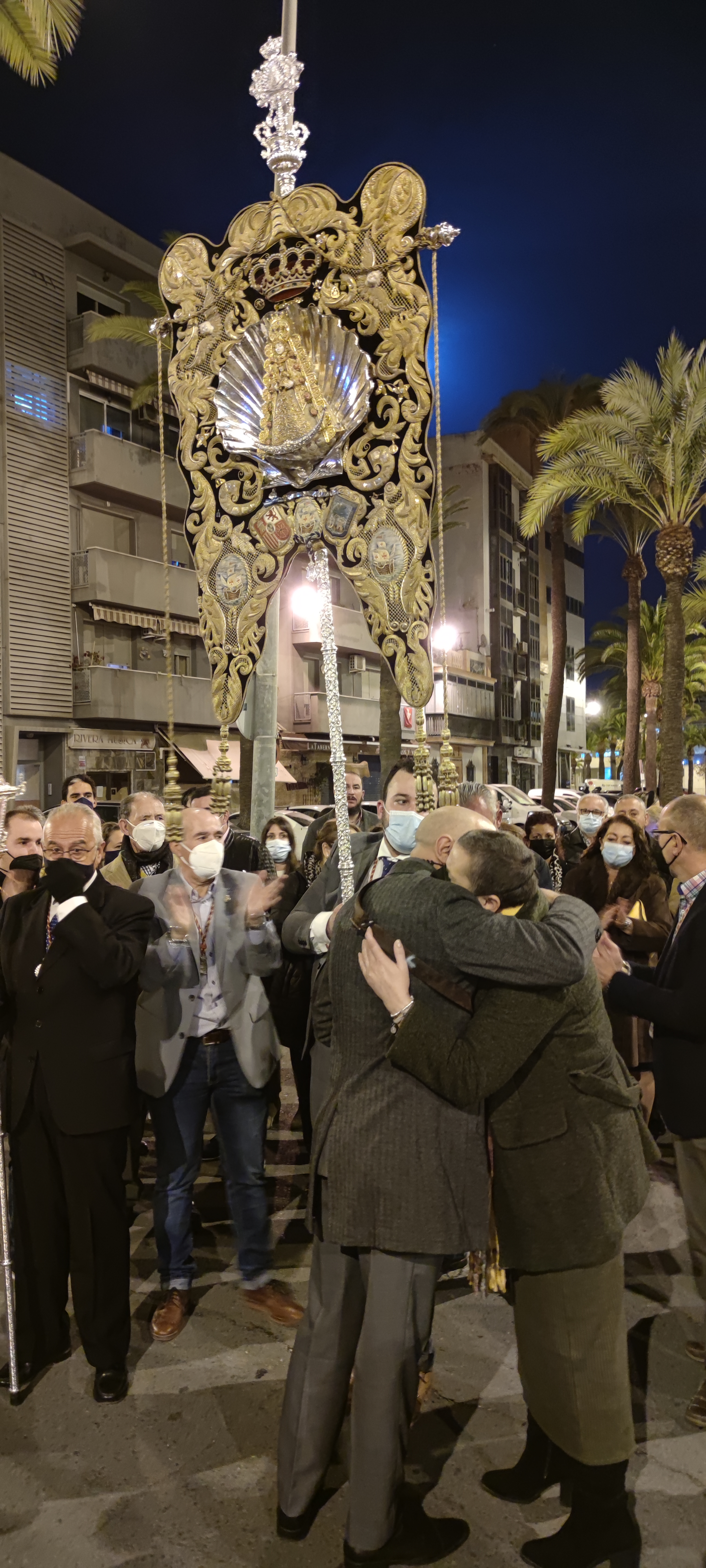 Tras la exaltación el Simpecado de la Concha Peregrina emprendía su peregrinación de vuelta a su capilla en el paseo de la Glorieta, viviéndose momentos de mucha emoción como la despedida de la Concepción donde será recordada por ser el escenario de la primera exaltación navideña que la filial rociera celebra fuera de su casa, como manifestó Francisco José Garrido, presidente de Emigrantes. Después del canto de la Salve el Simpecado salía bajo lluvia de pétalos de rosa.
