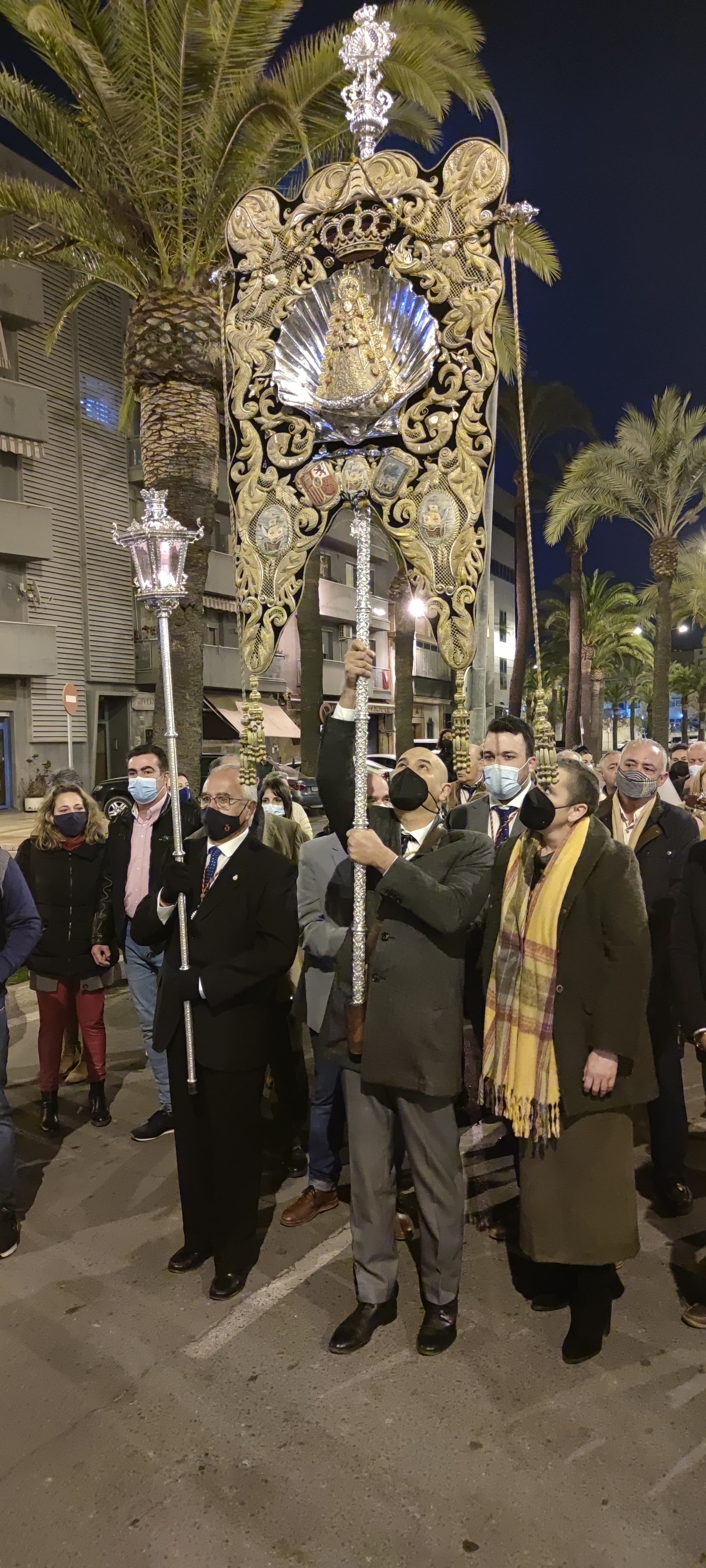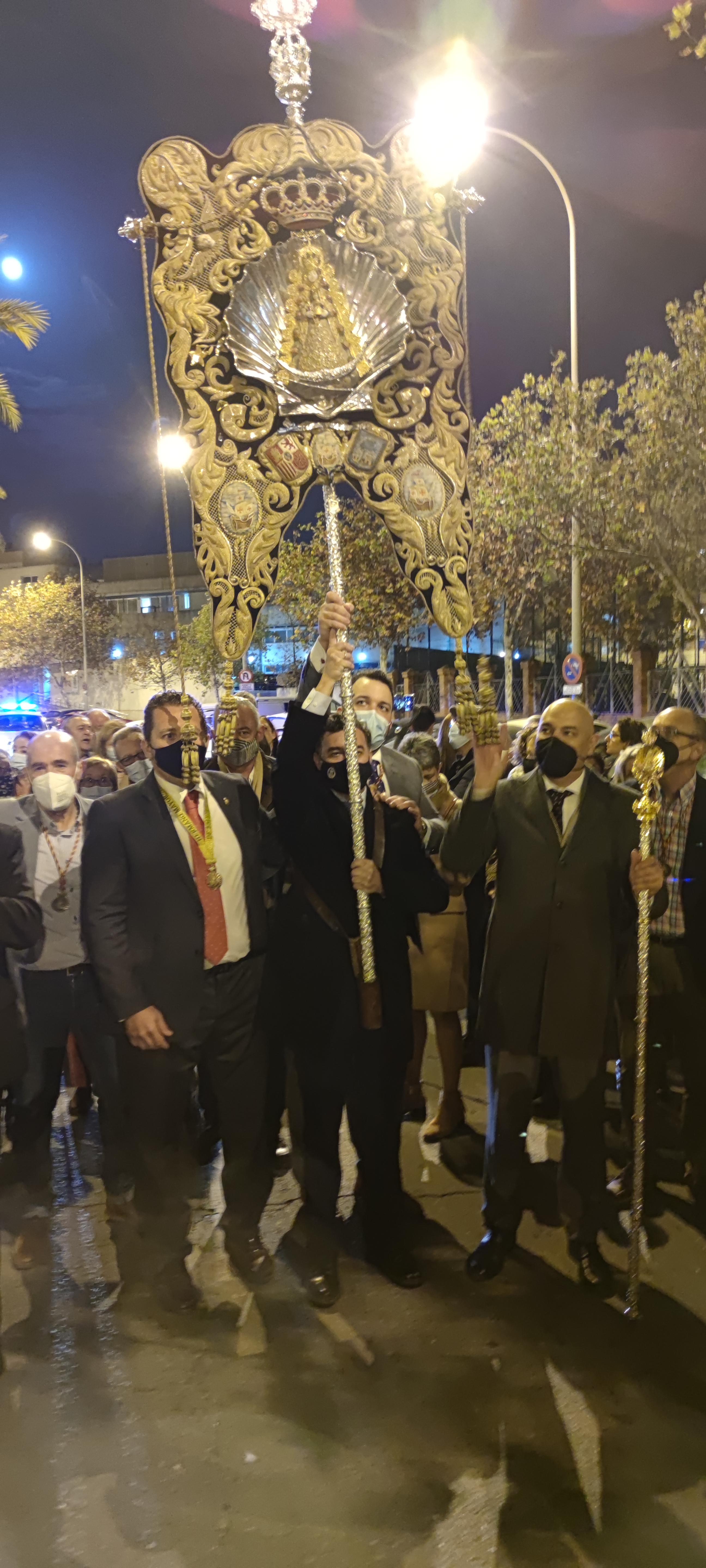 Durante el trayecto se fueron alternando todos aquellos hermanos y devotos que habían solicitado portar el Simpecado. Emocionante fue el último tramo, cuando el presidente, junto a su esposa, fueron los encargados de llevarlo hasta el dintel de la capilla y el hermano mayor, José Antonio Ortiz Morano volvía a repetir los vivas a la Virgen del Rocío, a la Blanca Paloma, a la Virgen de Gracia, a la Hermandad de la Santa Cruz, Hermandad de Emigrantes, y Pastorcito Divino.