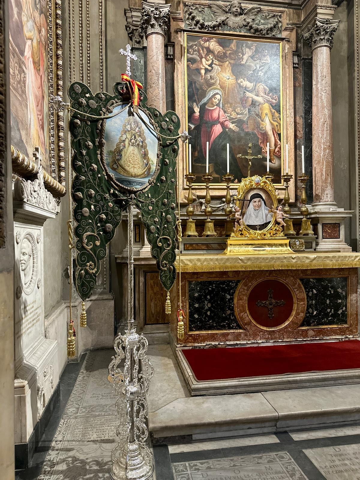 La peregrinación realizada esta semana a Roma por la Hermandad Matriz ha servido también para hacerle una puesta a punto al Simpecado Verde, al que se le ha cambiado el cordón de oro entrefino y las borlas.
