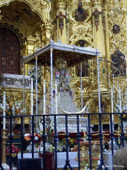 Gil Cabrera también relató que los almonteños trasladaron, alrededor de las ocho de la mañana de hoy, la imagen de su patrona, la Virgen del Rocío, hasta el altar mayor, después de cumplir con la tradición y ser vestidas por las camaristas, que le impusieron el 'traje de reina' para presidir la romería que se celebra el próximo fin de semana.