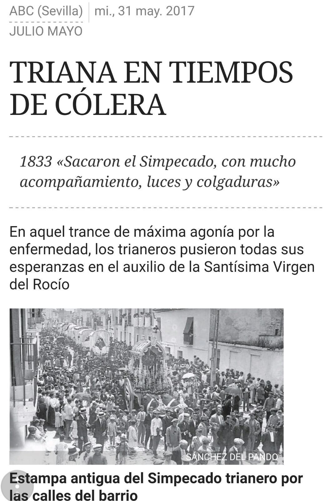 El concepto del Rocío, que hoy tanto se vincula a aspectos lúdicos y folclóricos, estuvo asociado en el pasado, al poder milagroso de la Virgen y la profunda veneración que la devota imagen consiguió atraer de las personas más sencillas y humildes de la población. En septiembre de 1833, se suscitó en Sevilla un pánico terrible como consecuencia de las numerosas muertes que comenzaron a registrarse a diario. No paraban de fallecer en Triana gitanillos pobres que vivían en chozas inmundas, y habitantes indefensos, hacinados en corrales de vecinos insalubres, todos ellos contagiados por el cólera-morbo asiático. Unos trabajadores del puerto se habrían contagiado de varios tripulantes coléricos de un barco inglés que vino a descargar lana. Así se introdujo la enfermedad; de ahí que el primer foco importante de contagio resultase ser Triana. Por esta razón, el ayuntamiento se vio obligado a incomunicar el barrio, cortando el puente y retirando los barcos de aquella orilla. Y en aquel trance de máxima agonía, los trianeros pusieron todas sus esperanzas en el auxilio de la Santísima Virgen del Rocío, cuyo simpecado recorrió las calles del arrabal a las que no querían acudir ni los mismos médicos, mientras que en la catedral se habían celebrado ya las primeras rogativas oficiales en presencia de todas las autoridades locales.