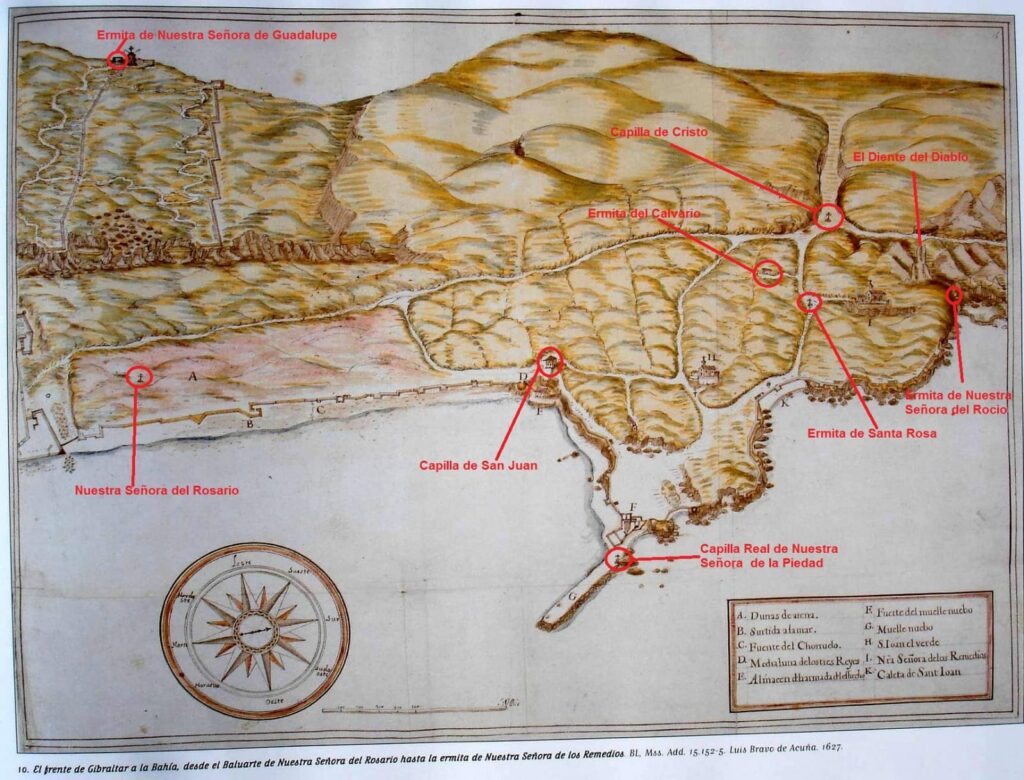 El Hermano Mayor de la Hermandad del Rocío de la Línea de la Concepción, como continuación de las conversaciones mantenidas con ocasión de la reciente celebración de la Asamblea Comarcal de los Caminos de Cádiz en aquella ciudad, me facilita una amplia información gráfica de los avances de la investigación sobre la existencia de una Ermita dedicada a la Virgen del Rocío o Roxío en el siglo XVII en Gibraltar, antes de la ocupación inglesa, cuando era propiedad de la Casa Ducal de Medina Sidonia, que está realizando un historiador de la roca. Una información inédita hasta ahora de la historia del Rocío de la que dará buena cuenta el próximo número de la revista de investigación EXVOTO.
