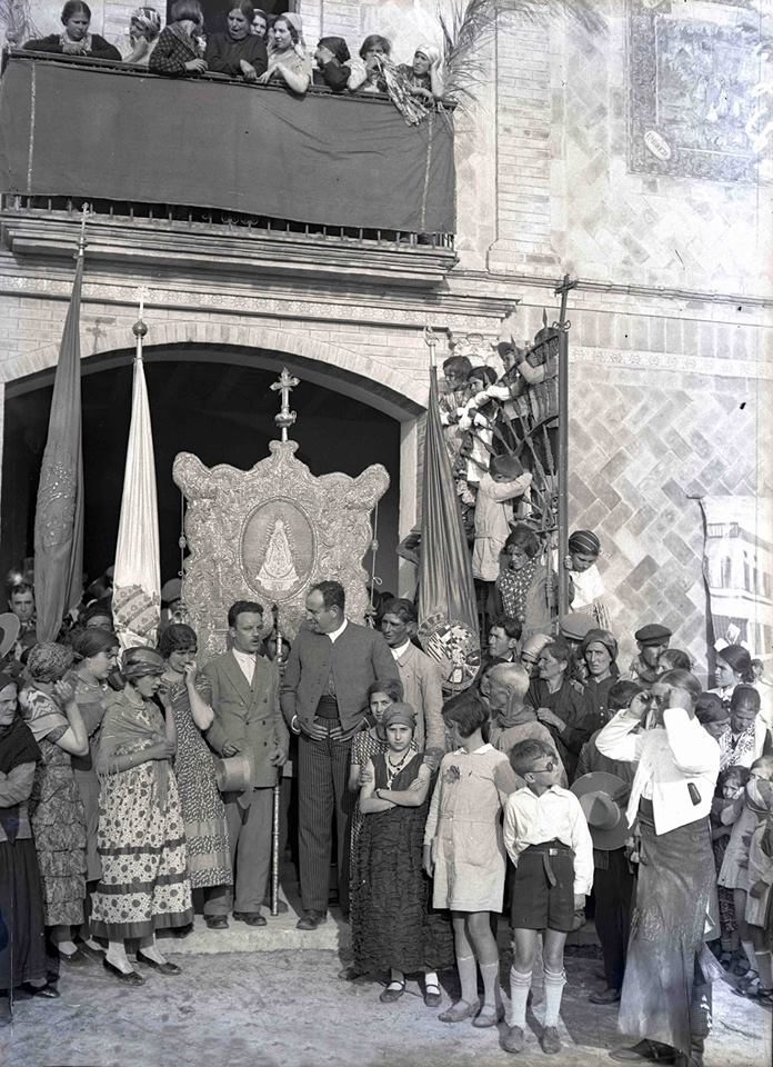 Su cronología abarca entre 1919 (año que se realiza la fachada de ladrillos de barro para la Coronación) y 1943, (cuando se alicata con los azulejos grisáceos). Me atrevería a datarla en la década de 1930, por los atuendos, y por la fotografía enorme que hay justo apoyado en la fachada en la parte derecha de la imagen, creo que para inmortalizar retratos de los devotos en la romería. Existe algunas más justo en el mismo sitio en diferentes años de la década 30. Una pena de no disponer información del hermano mayor que aparece en esta instantánea.