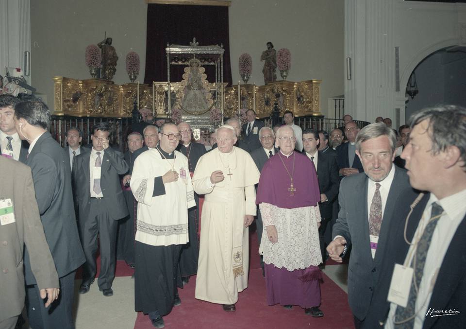 Era un junio radiante. La marisma estaba amarilla y reseca como de costumbre por estas fechas. Permanecían muy vivas en nuestras retinas, las imágenes y los momentos estelares vividos en este mismo lugar, en septiembre pasado, con ocasión de la clausura de los congresos internacionales mariano y mariológico. El gran acontecimiento que había traído hasta las marismas a la jefatura del estado, a las altas instancias de la Junta de Andalucía, y a todo un Legado Pontificio, el cardenal Martínez Somalo. Otra vez el Rvdo. Juan Mairena Valdayo se había salido con la suya. Había movido cielos y tierras para colocar el Rocío en el lugar que se merecía. Hasta última hora hubo dudas. Razonables dudas. La visita al Rocío había entrado en agenda con un calzador, y cualquier contratiempo podía malograrla, con una agenda tan apretada, y con un calor de justicia, que no era muy recomendable para el Papa polaco. Tucci y Amigo Vallejo fueron los grandes aliados. Y en Almonte, el Presidente de la Matriz y el capellán y director espiritual de la hermandad, Antonio Salas Delgado, y las autoridades civiles. Sobraban nervios y emoción contenida. Una multitud entusiasta llenaba toda la explanada, pese a que había estado en Sevilla, y este mismo día en Huelva. Pero la imagen merecía la pena. Todo un sucesor de Pedro a los pies de la Blanca Paloma. El sueño realizado de rocieros de muchas generaciones.