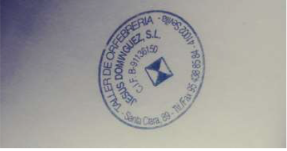 Fotografía del diseño de la carreta de plata, realizado por Jesús Domínguez Vázquez (anverso) y del sello de su taller de orfebrería (reverso).