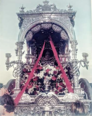 No me puedo olvidar aquí del mimo y el cuidado que nuestras vecinas Antonia Márquez Garrido, Antoñita Solís Colchero, y Rocío Cabello Muñoz y su madre, Trinidad Muñoz Domínguez, que estuvieron siempre al cuidado de que a la Virgen del Simpecado viejo que, a partir de ahora se cobija en esta nueva casa, en la carreta antigua de madera, que le sirve de retablo, no le faltara nunca unas flores, y que la cristalera, por donde los manriqueños y devotos le rezaban, estuviera siempre limpia y reluciente.