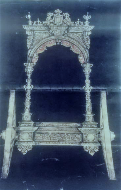 En un cuaderno o bloc, Jesús Domínguez hizo dibujos del frontal, de uno de los laterales y del interior del techo. Dijo que el templete era elegante, pero que estaba desproporcionado en sus medidas de altura y anchura. Y propuso que se suplementara el eje de las ruedas en unos 90 centímetros, y los limones con una tablazón a cada lado.