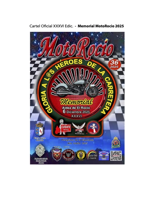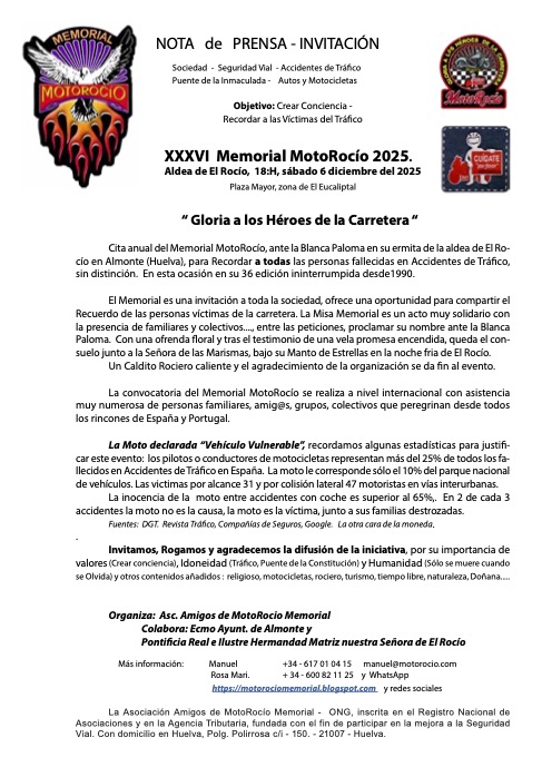 Cita anual del Memorial MotoRocío, ante la Blanca Paloma en su ermita de la aldea de El Ro- cío en Almonte (Huelva), para Recordar a todas las personas fallecidas en Accidentes de Tráfico, sin distinción. En esta ocasión en su 36 edición ininterrumpida desde 1990.