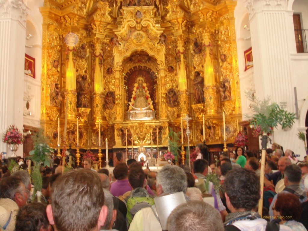 • A las 13:00 h.: Santa Misa en el Altar de la Santísima Virgen del Rocío, con Comunión General de los hermanos Peregrinos, cantando al finalizar la Salve Rociera.