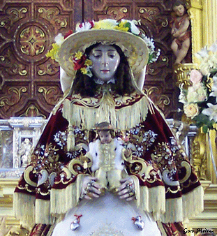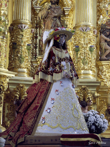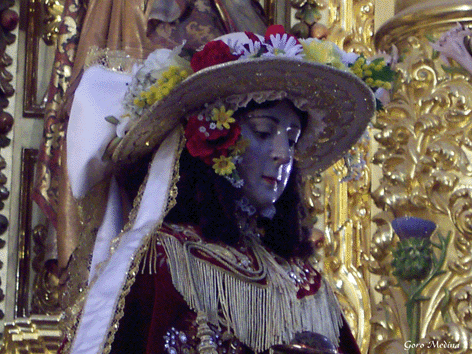 | Entre los estrenos que presenta, cabe destacar el nuevo sombrero, regalo de los Sacerdotes y Santeros del Santuario, así como la Capa que hace un año le regalara el Taller de Bordado de Jerez. | ||||||||||||||||||||||||||